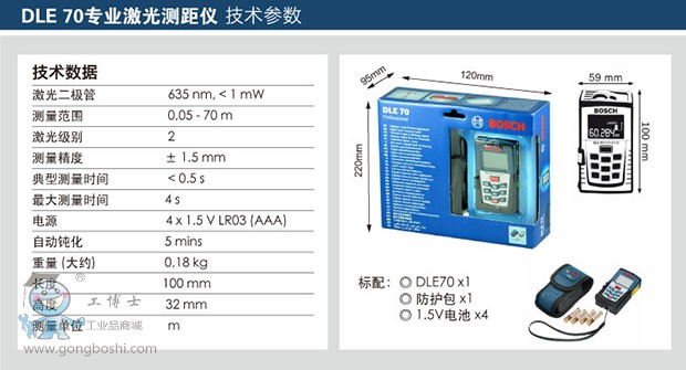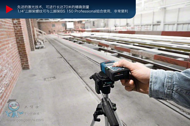 先進的激光技術,可進行長達70米的精確測量。 1/4"三腳架螺紋可與三腳架BS 150 Professional組合使用,非常便利