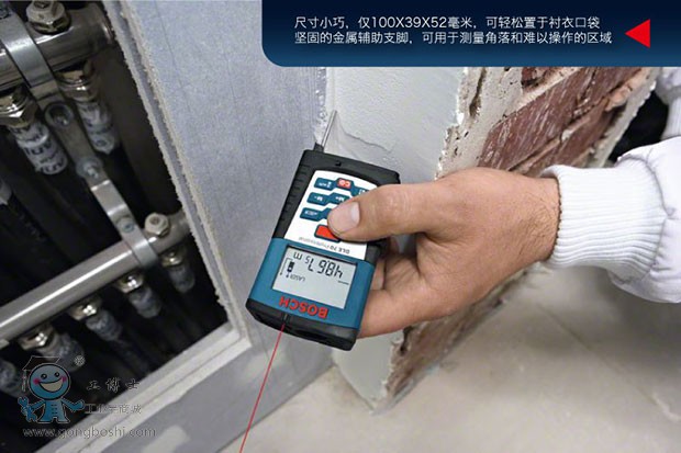 尺寸小巧,僅100X39X52毫米,可輕松置于襯衣口袋。 堅固的金屬輔助支腳,可用于測量角落和難以操作的區域