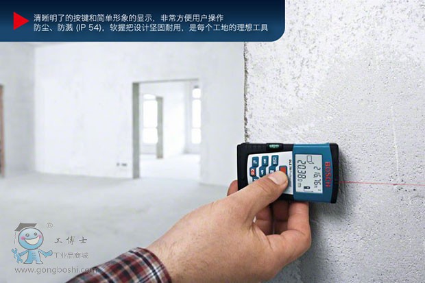 清晰明了的按鍵和簡單形象的顯示,非常方便用戶操作。 防塵、防濺 (IP 54),軟握把設計堅固耐用,是每個工地的理想工具
