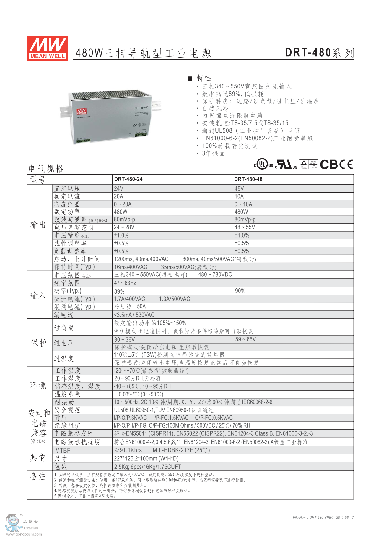 明緯DRT-480-48 48V10A三相導(dǎo)軌工業(yè)電源 |