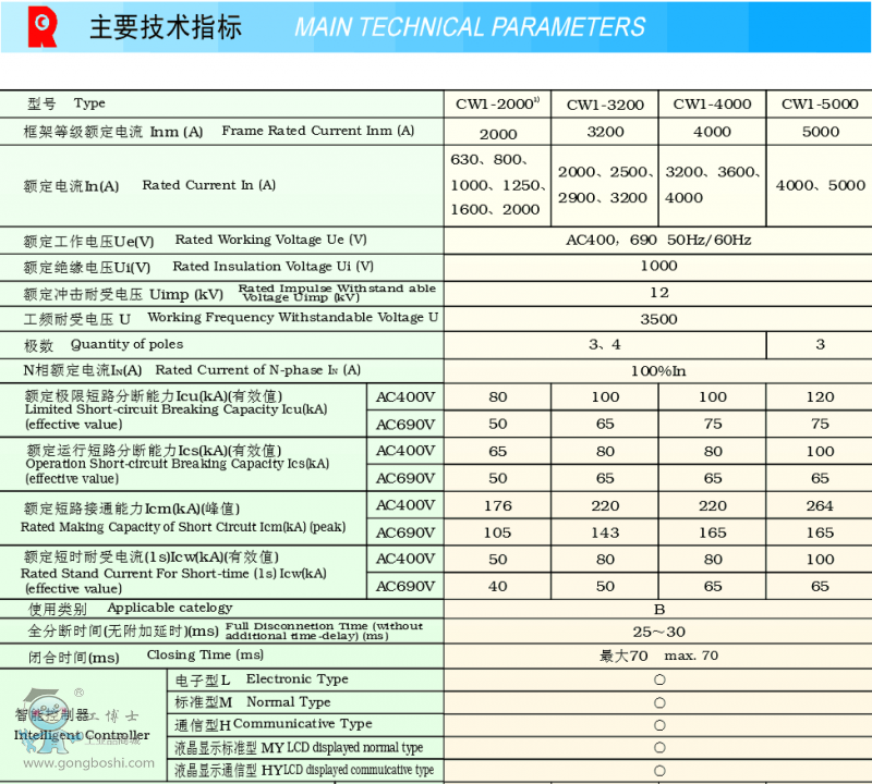 CW1系列智能型萬能式斷路器用于控制和保護低壓配電網絡。一般安裝在低壓配電柜中作主開關起總保護作用。額定電流1000A及以下的斷路器,還可作電動機保護用。產品可提供濕熱帶型(TH型)、船用型和1E級斷路器,可提供低溫至-40℃斷路器,并可提供液晶顯示及數碼管顯示斷路器。