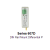 SERIES 607D DIN Rail Mount Differential Pressure Transmitter senses the pressure of air and compatible gases and sends a standard 4 to 20 mA output signal. The 607D housing is specifically designed to mount on a 35 mm DIN rail in a panel. This mounting style allows for several units to be mounted closely together reducing required space. A wide range of models are available factory calibrated to 0.25% full scale accuracy in ranges from the very low 0.1 in w.c. to 25 in w.c. The span and zero controls are for field calibration. Units also include red/green LED status of proper transmitter operation. Versatile circuit design enables operation in 2-wire current loops.