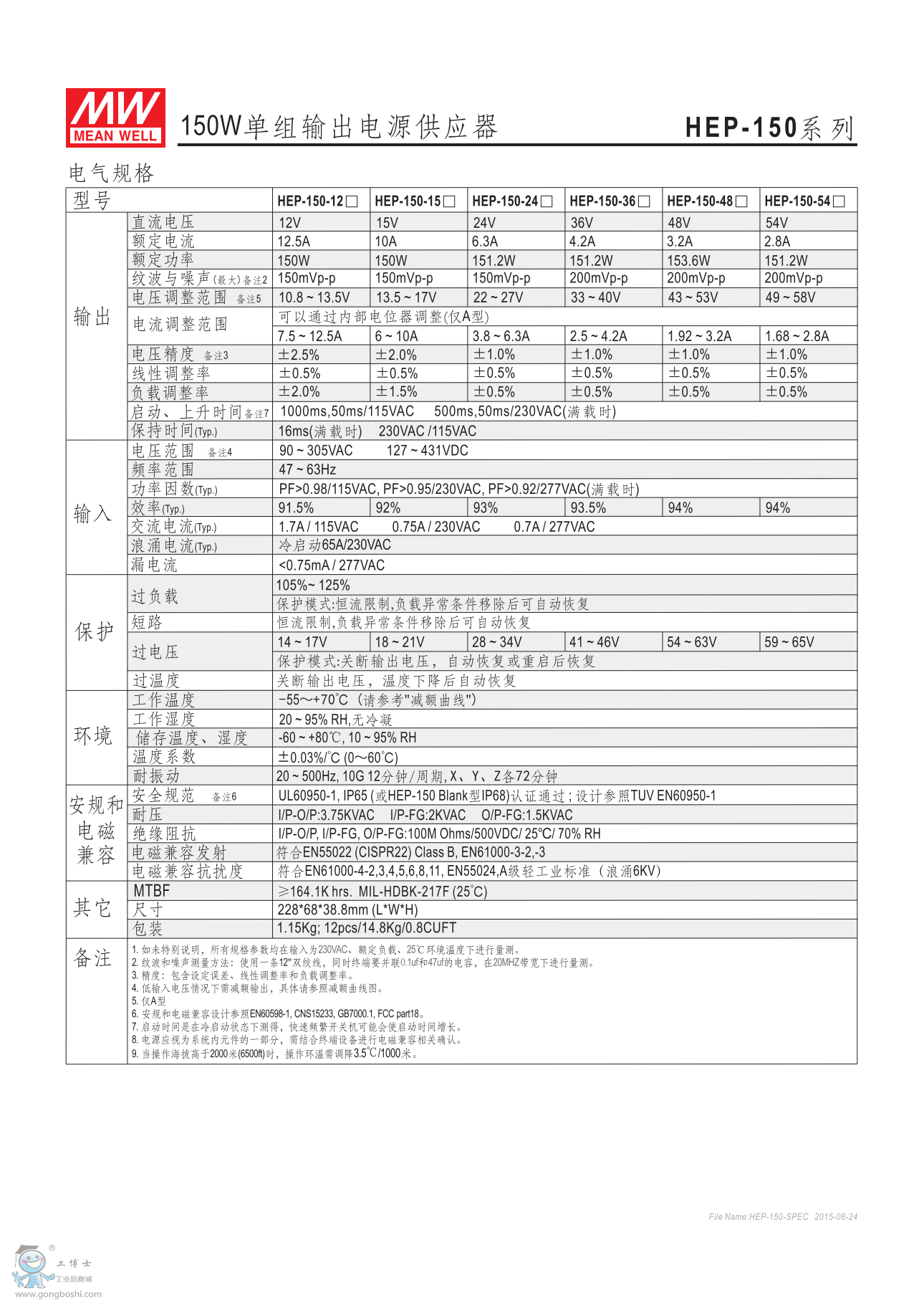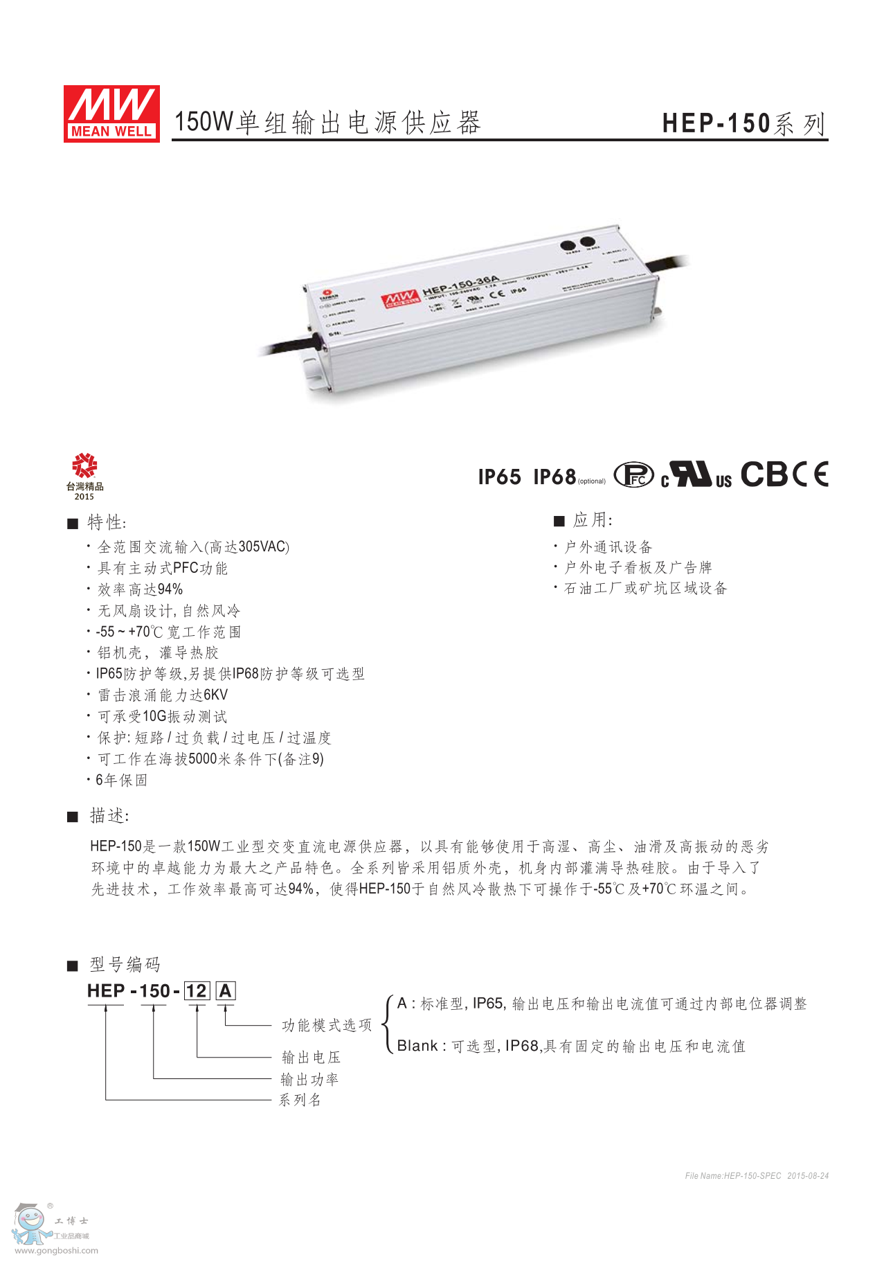供應型號: HEP-150-12A HEP-150-15A HEP-150-24A HEP-150-36A HEP-150-48A HEP-150-54A 型號尾綴帶“A”代表防護等級是IP65 不帶是代表防護等級IP68