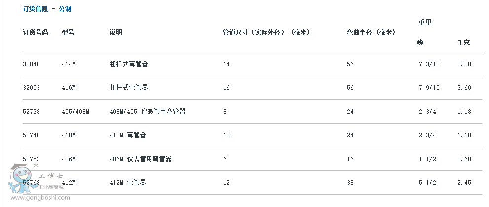 設計用于將壁厚不超過 0.06" (1.5 mm) 的退火銅、鋼和不銹鋼管道彎曲*大 180°。