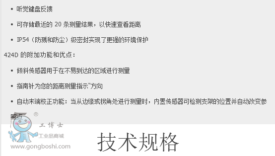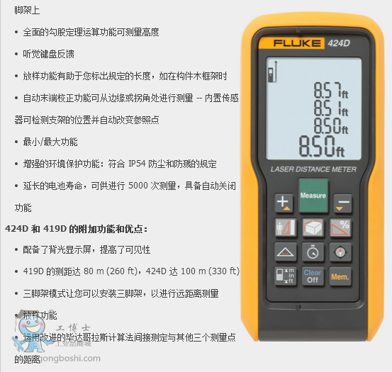 新型 Fluke 424D 是我們*先進的多功能激光測距儀,可在更多的情況下為您節省更多的時間。其測距更長,達 100 米(330 英尺)。該測距儀配備了更大的 4 行顯示屏、內置指南針和 180º 傾斜傳感器,用于對準和高度追蹤。