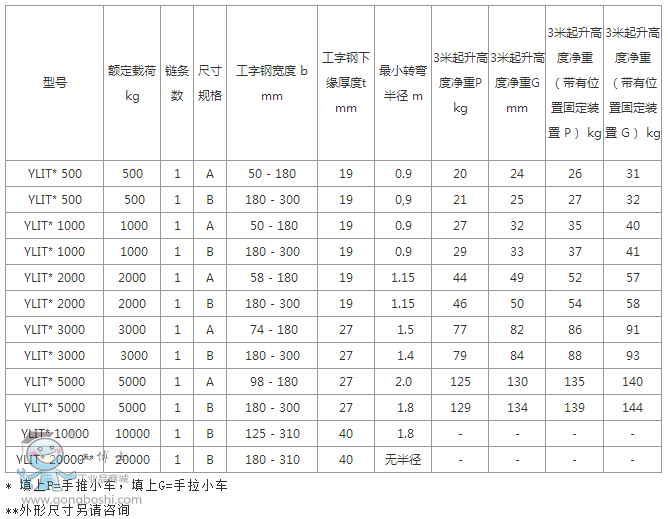 額定載荷5噸以下的小車可以設置為兩種基本標準規格,A型小車適合*大寬度180毫米的工字鋼,同時可以方便的轉換為B型以適合*大寬度為300毫米的工字鋼。