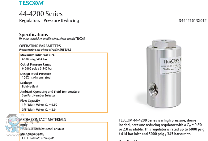 TESCOM 44-4200 Series is a high pressure, dome loaded, pressure reducing regulator with a Cv = 0.80 or 2.0 available. This regulator is rated up to 6000 psig