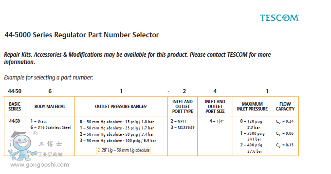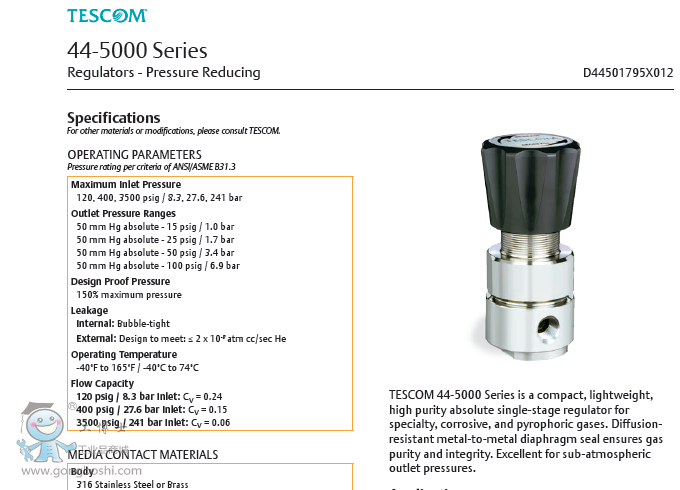 TESCOM 44-5000 Series is a compact, lightweight, high purity absolute single-stage regulator for specialty, corrosive, and pyrophoric gases. Diffusionresistant
