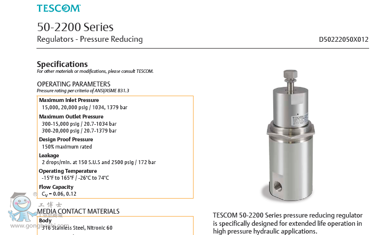 TESCOM 50-2200 Series pressure reducing regulator is specifically designed for extended life operation in high pressure hydraulic applications.