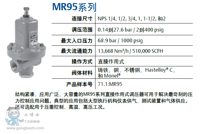 結構緊湊,應用廣泛,大容量的MR95系列直接作用式調壓器可用于解決*苛刻的壓