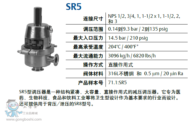 SR5型調壓器是一種結構緊湊,大容量,直接作用式的減壓調壓器。它專為醫藥,生物科技,食品和飲料工業等將衛生型設計作為基本要求的行業而設計。還可提供用于背壓/泄壓的SR8型號。