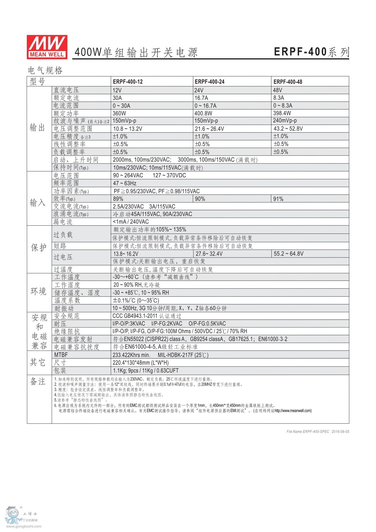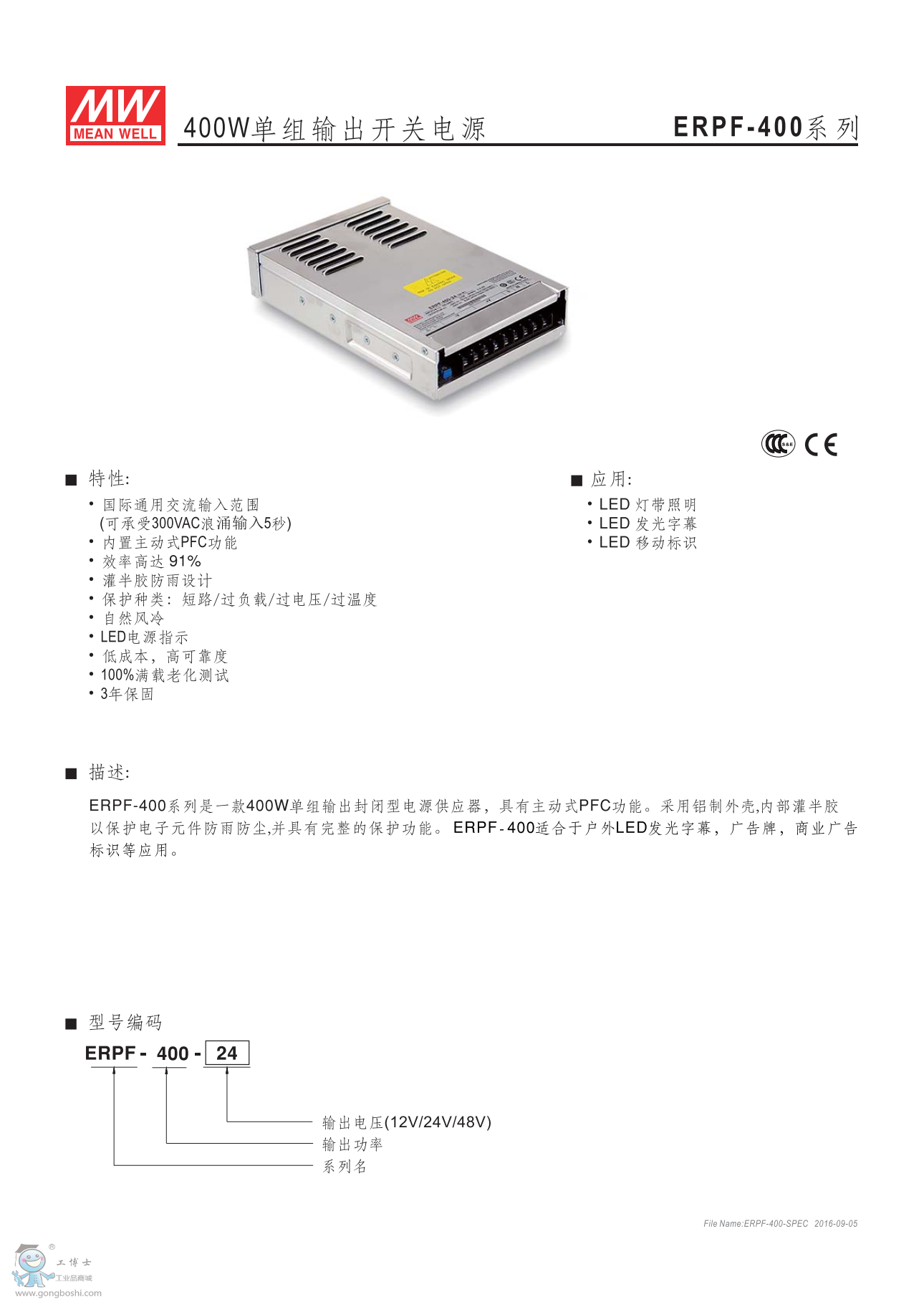 明緯防雨電源ERPF-400-12 400W顯示屏專用