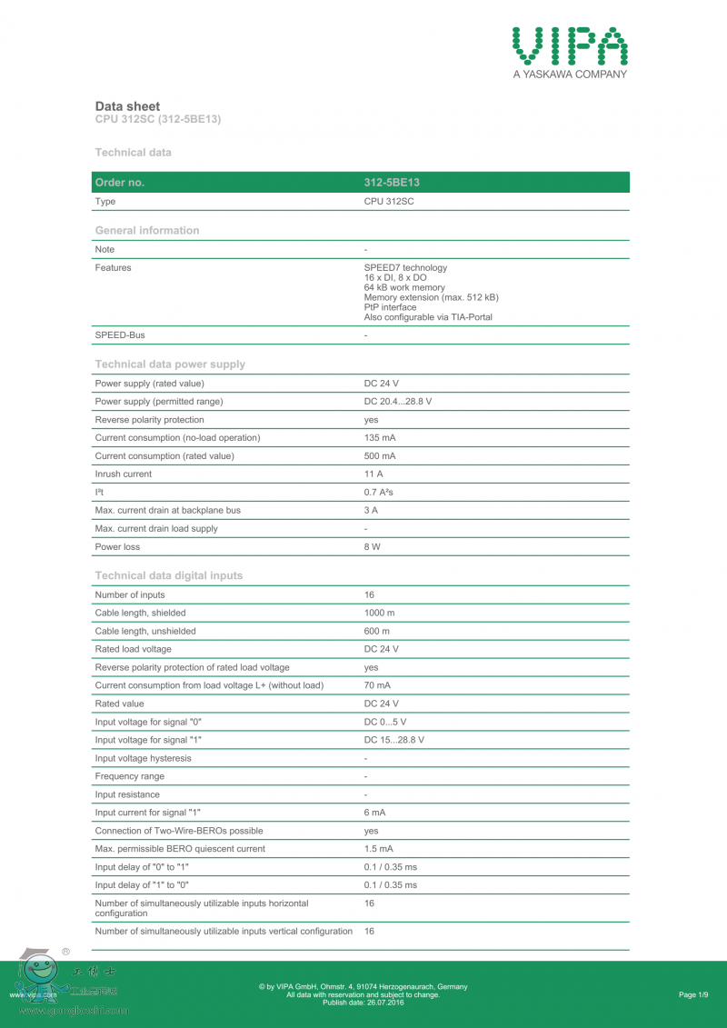 Yaskawa安川VIPA PLC 300S系列CPU單元模塊 312-5BE13