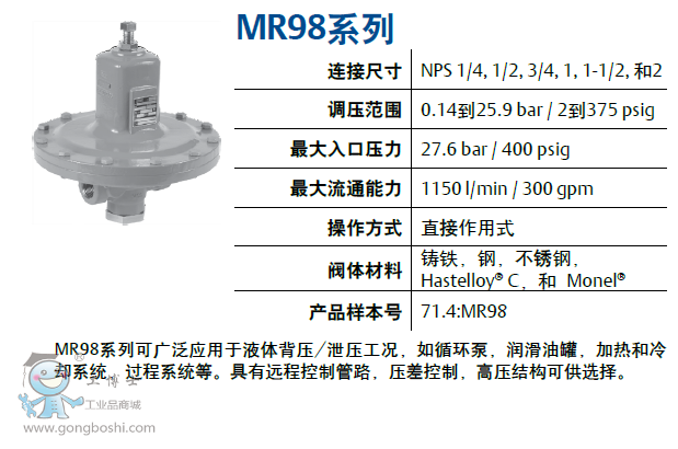 選擇液體調壓器,我們必須考慮調壓器的材料特性。艾默生在設計上充分考慮了這些因素,提供了具有*好耐酸和耐腐蝕性的調壓器。費希爾品牌的調壓器無論是小流量還是大流量要求,均能穩定工作。 MR98系列可廣泛應用于液體背壓/泄壓工況,如循環泵,潤滑油罐,加熱和冷卻系統,過程系統等。具有遠程控制管路,壓差控制,高壓結構可供選擇。