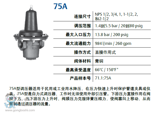75A型調(diào)壓器適用于民用或工業(yè)用水降壓,在壓力快速上升時(shí)保護(hù)管道夾具或儀表。75A型是自力式調(diào)壓器,工作時(shí)無(wú)須使用外部引壓管。下游壓力直接作用在閥膜下方,當(dāng)下游壓力上升時(shí),閥膜壓力克服彈簧壓縮力,使閥塞向上移動(dòng),從而限制通過(guò)調(diào)壓器的流量。