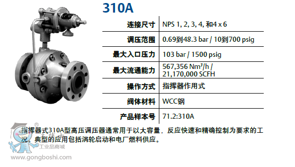 指揮器式310A型高壓調壓器通常用于以大容量,反應快速和精確控制為要求的工況。典型的應用包括渦輪啟動和電廠燃料供應。