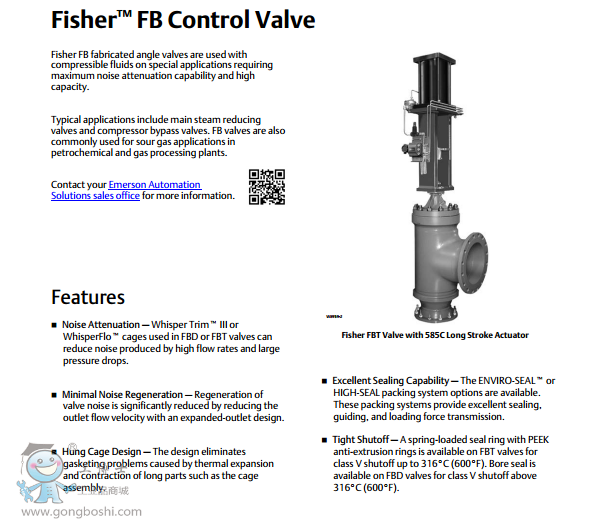 Fisher® FB 和 FBG 焊接式角閥和直通閥控制可壓縮流體,可用于需要*大減噪和高流通能力的特殊應用。典型的應用包括主蒸汽減壓閥和壓縮機旁通閥。FB 和 FBG 閥門通常還用于石油化工和天然氣加工廠的酸性氣體應用。