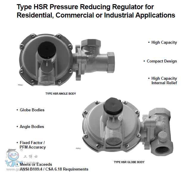 Fisher HSR 型直接作用式彈簧負載調壓器可在各種住宅、商業和工業應用中提供經濟的減壓控制功能。 HSR 型調壓器可用于天然氣、人工煤氣或液化石油氣。此外,HSR 型調壓器的閥膜具有內部泄壓功能,有助于*大限度地降低過壓。如果任何出口壓力高于非可調節泄壓閥彈簧的釋放設定點,會使閥膜離開泄壓閥閥座,從而讓過高的壓力通過篩網式彈簧箱通氣組件排出。HSR 型調壓器滿足 ANSI B109.4 / CGA 6.18 標準。