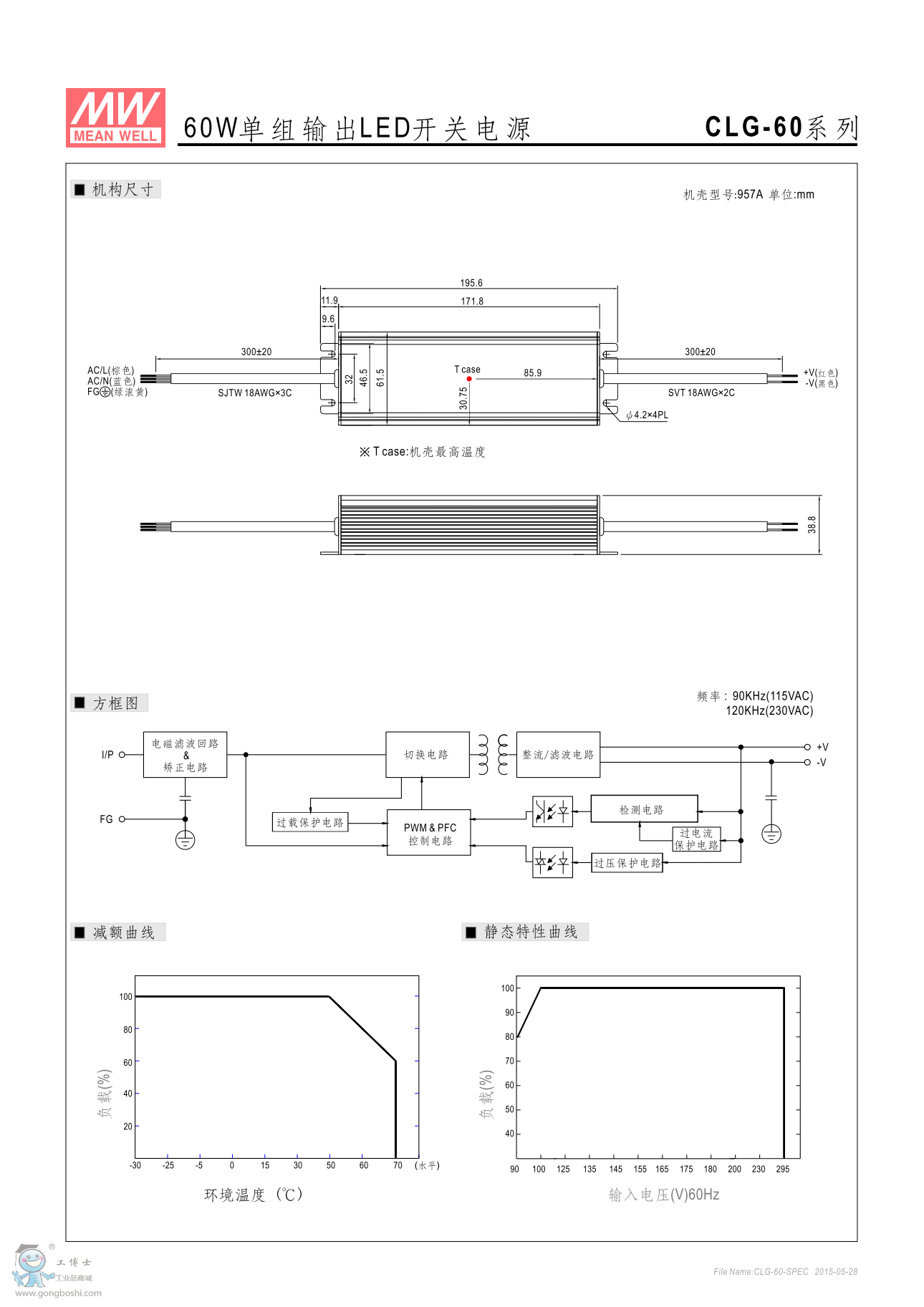 功能特性 • 90~295VAC交流輸入,內建主動式功率因子矯正功能(active PFC)