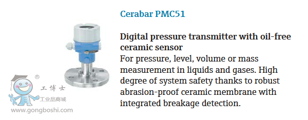 Cerabar PMC51數字壓力變送器采用無油電容式陶瓷測量元件,主要用于過程工業和衛生行業,可測量液體和氣體的壓力、液位、體積和質量。PMC51使用耐真空陶瓷膜片,確保測量系統高度安全。量程可調,快速設定功能使調試更簡單,節省成本和時間。設計符合IEC61508和IEC 61511標準,滿足SIL2功能安全要求。