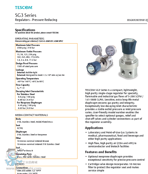 TESCOM SG3 Series is a compact, lightweight,high purity single-stage regulator for specialty, flammable and industrial gas flows of 5-200 SCFM /141-5600 SLPM. Sensitive, extra long-life metal diaphragm ensures gas purity and integrity.