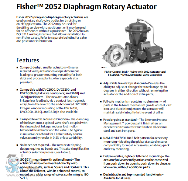 Fisher® 2052彈簧膜片旋轉式執行機構可在旋轉軸型閥體上使用,適用于節流或開關應用。2052 可用于帶有定位器的節流應用,也可用于不帶定位器的開關工況。2052 具有 ISO 5211 裝配接口,可以安裝到非 Fisher 閥門上。