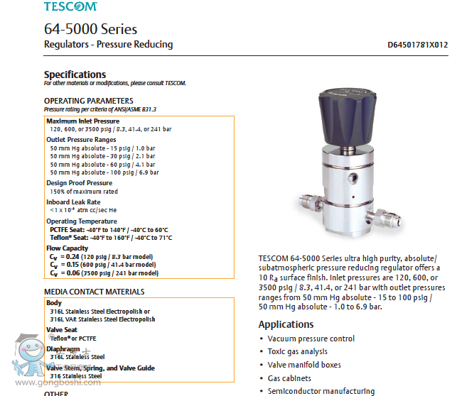 TESCOM 64-5000 Series ultra high purity, absolute/ subatmospheric pressure reducing regulator offers a 10 Ra surface finish. Inlet pressures are 120, 600, or 3500 psig / 8.3, 41.4, or 241 bar with outlet pressures ranges from 50 mm Hg absolute - 15 to 100 psig / 50 mm Hg absolute - 1.0 to 6.9 bar.