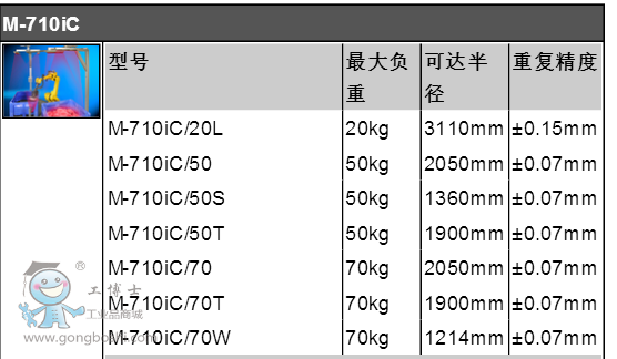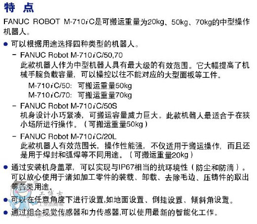 發那科機器人M-710iC系列是一款可搬運重物為20kg,50kg,70kg的中型操作機器。