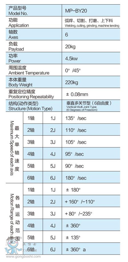 微柏機器人 MP-BY20 負載20kg 臂展1722mm 6軸機器人 |