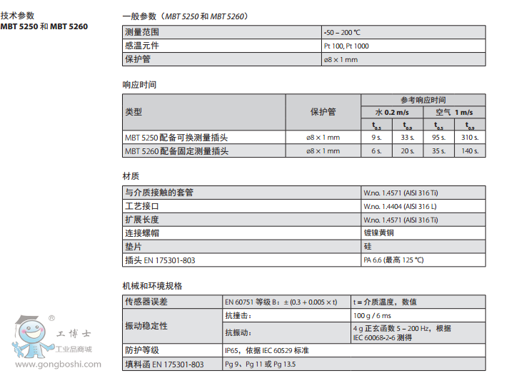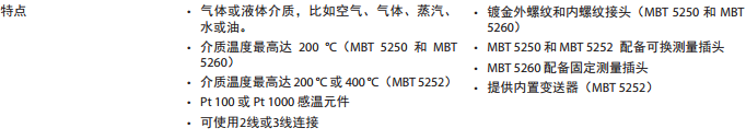 該溫度傳感器采用標(biāo)準(zhǔn)的 Pt100 或 Pt1000 元件,后者可以實(shí)現(xiàn)可靠的高精度測(cè)量。 根據(jù)客戶要求,MBT 5250 在交付時(shí)也可以配備 NTC/PTC 元件。