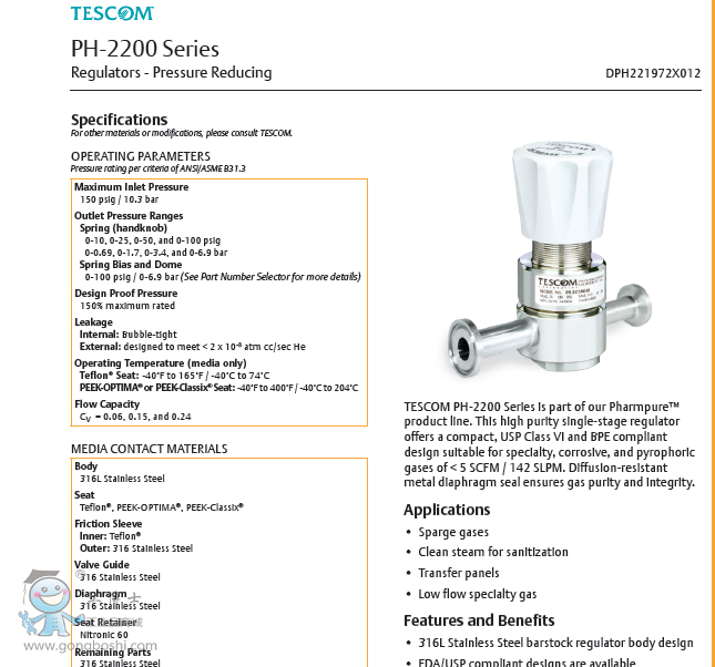TESCOM PH-2200 Series is part of our Pharmpure™ product line. This high purity single-stage regulator offers a compact, USP Class VI and BPE compliant design suitable for specialty, corrosive, and pyrophoric gases of < 5 SCFM / 142 SLPM. Diffusion-resistant metal diaphragm seal ensures gas purity and integrity.
