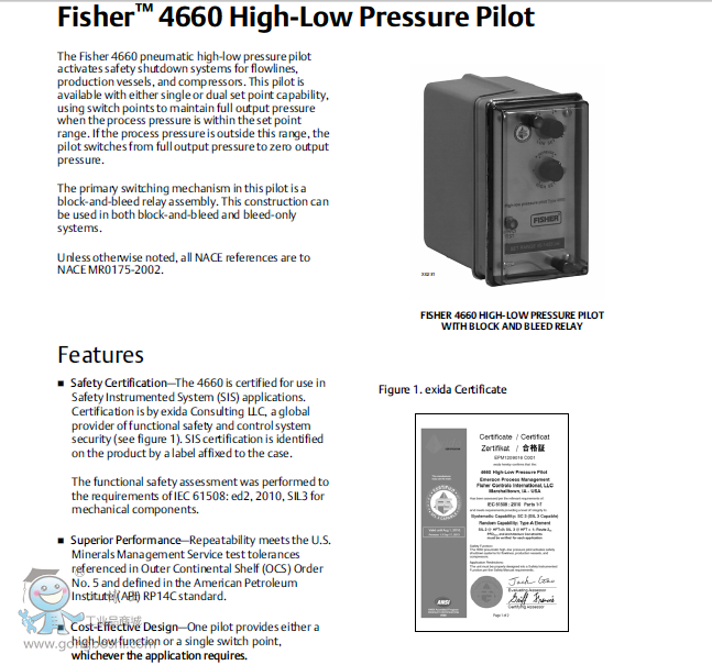 Fisher費希爾4660氣動先導式壓力控制器可為出油管線,生產容器和壓縮機激活安全停機系統.費希爾4660產品文檔,特性及優勢,應用規范.
