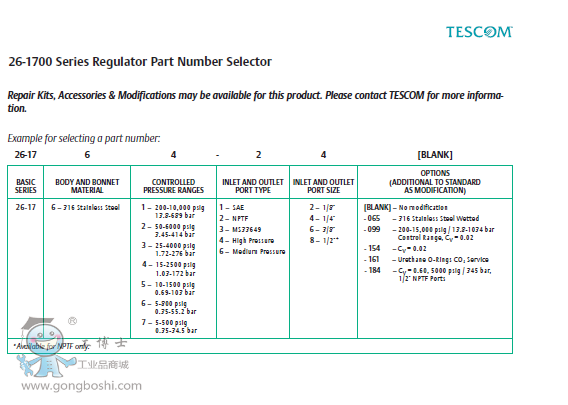 TESCOM 26-1700 Series regulator controls pressures up to 15,000 psig / 1034 bar and is suitable for gas or liquid service.