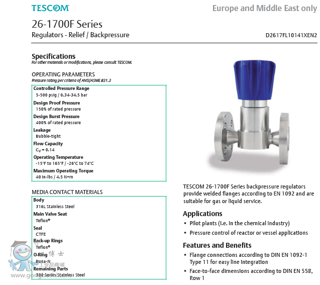 TESCOM 26-1700F Series backpressure regulators provide welded flanges according to EN 1092 and are suitable for gas or liquid service.