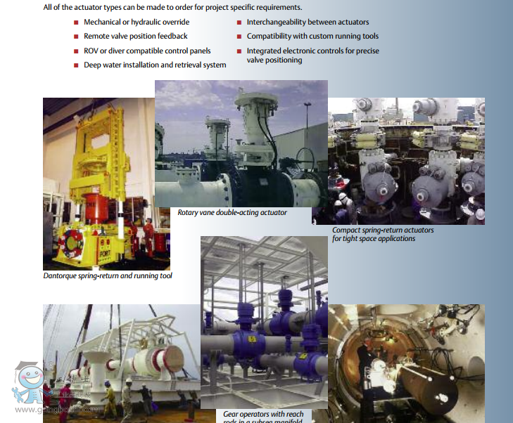 A hydraulic, scotch yoke, actuator that is well suited for splash zone, riser and other offshore failsafe applications. They are available with diver or ROV intervention systems.