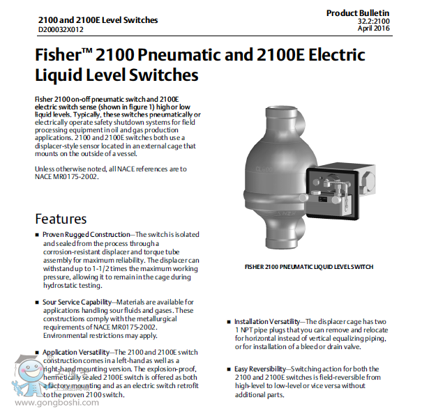 開關型 Fisher®2100 氣動開關和 Fisher 2100E 電動開關可感知高低液位。通常,這些開關 以氣動或電動方式操作石油和氣體生產應用中現場處理設備的安全關閉系統。2100 和2100E 型開關均使用浮子浮筒傳感器,安裝在一個容器外部的外浮筒中。可用于酸性氣體:(NACE) MR0175。