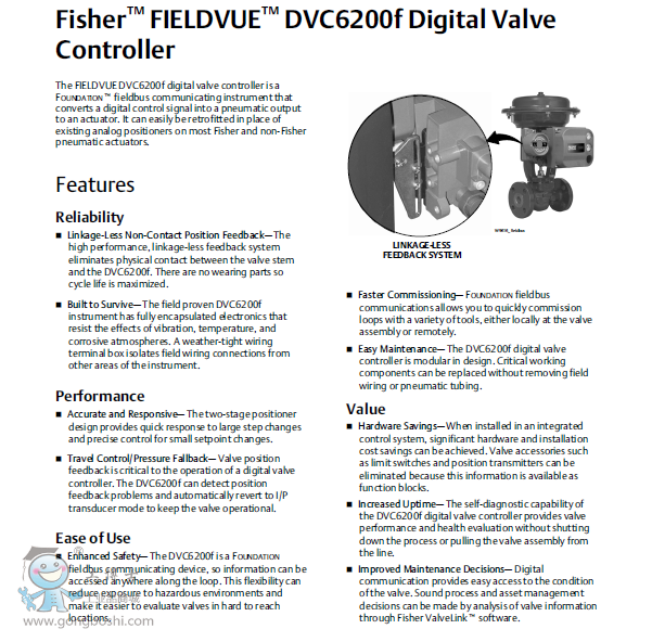 DVC6200f 已由 Fieldbus Foundation 注冊,使用獲得***的少連接、無接觸行程反饋技術。它提供全數字 Foundation 現場總線開放式通信協議。