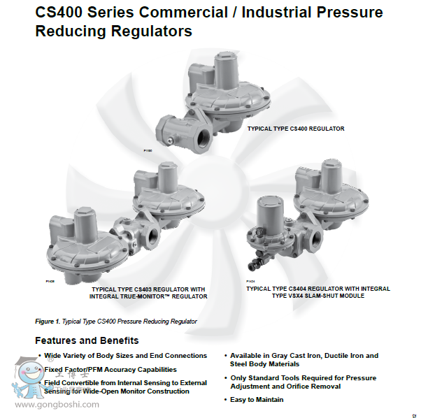 Fisher CS400 系列直接作用式彈簧負載型調壓器經過專門設計,可以滿足多種調壓場所,包括商用和工業設施。該調壓器具有很大的靈活性,是因為這種調壓器提供有多種閥體尺寸和端部連接方式、出口壓力設置、閥孔尺寸以及內取壓或外取壓選項。