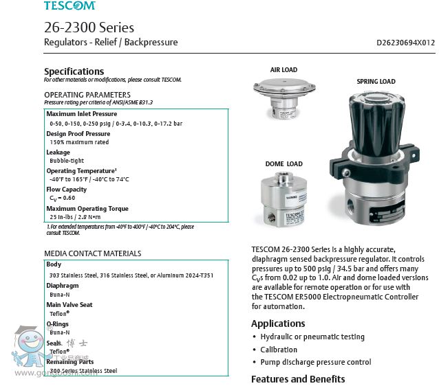 TESCOM 26-2300 Series is a highly accurate, diaphragm sensed backpressure regulator. It controls pressures up to 500 psig / 34.5 bar and offers many Cvs from 0.02 up to 1.0. Air and dome loaded versions are available for remote operation or for use with the TESCOM ER5000 Electropneumatic Controller for automation.