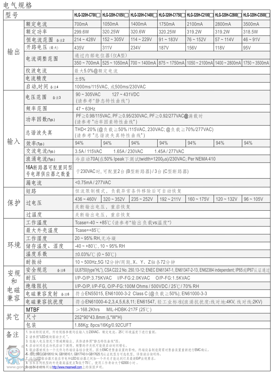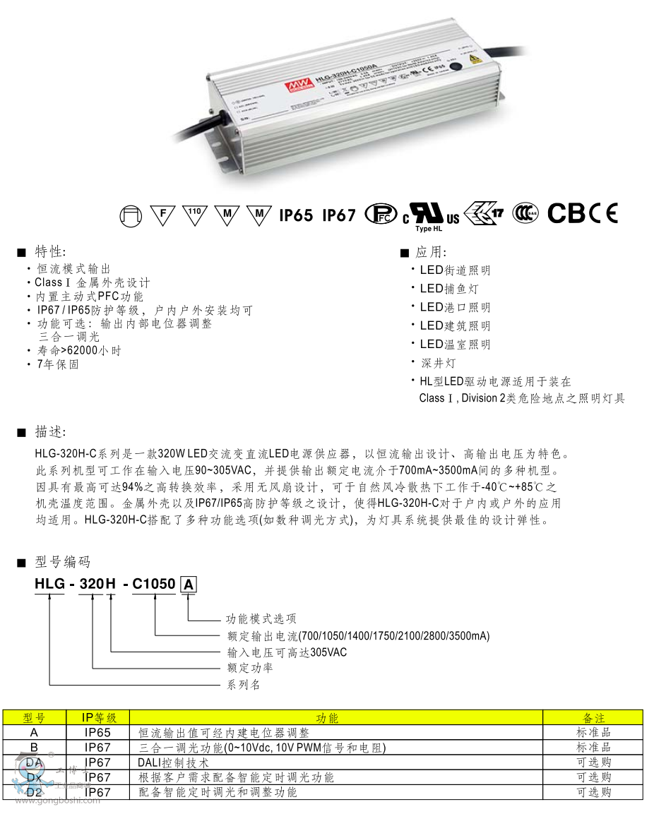 明緯防水LED電源HLG-320H-C1050C 7年保固