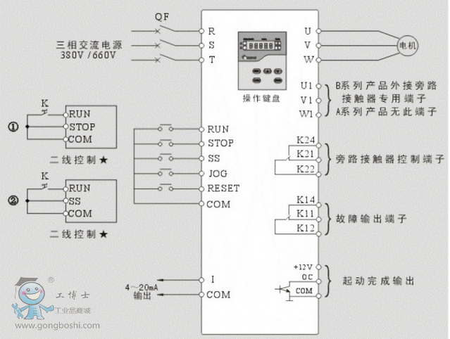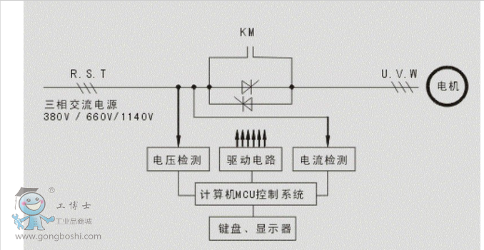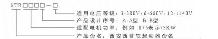 STR系列A型電動(dòng)機(jī)軟起動(dòng)器(見下圖白框內(nèi))的特點(diǎn)是將軟起動(dòng)單元及旁路接觸器同時(shí)裝在一個(gè)壁掛式的機(jī)殼內(nèi),當(dāng)被控電動(dòng)機(jī)起動(dòng)完成后,自動(dòng)將電機(jī)通過(guò)旁路接觸器投入電網(wǎng)運(yùn)行,其主電路有R.S.T.(接三相交流電源)和U.V.W(接三相交流電機(jī))六個(gè)接線端,接線后即可使用。特別對(duì)配電室空間小或機(jī)旁操作,掛在墻上通過(guò)操作鍵盤就可以控制電機(jī)的起動(dòng)、停止。STRA系列軟起動(dòng)器還預(yù)留有外部起動(dòng)、停止、故障復(fù)位等接口,可方便地實(shí)現(xiàn)遠(yuǎn)程監(jiān)控。其接線原理圖詳見下圖。STR系列A型軟起動(dòng)器內(nèi)置電子熱過(guò)載保護(hù)器,使用時(shí)不需另加電機(jī)保護(hù)元件。 STR系列A型軟啟動(dòng)型號(hào)說(shuō)明