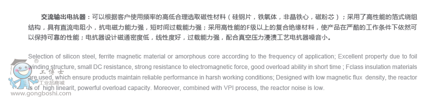 電抗器可以根據客戶使用頻率的高低合理選取磁性材料(硅鋼片,鐵氧體,非晶鐵心,磁粉芯);采用了高性能的箔式繞組結構,具有直流電阻小,抗電磁力能力強,短時間過載能力強;采用高性能的F級以上的復合絕緣材料,使產品在嚴酷的工作條件下依然可以保持可靠的性能;電抗器設計磁通密度低,線性度好,過載能力強,配合真空壓力浸漬工藝電抗器噪音小。