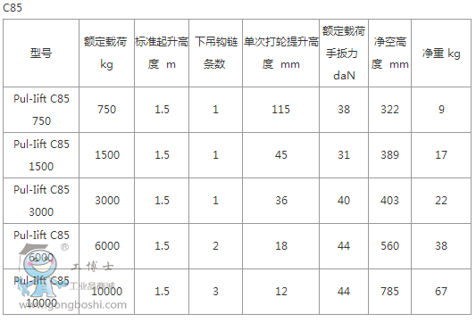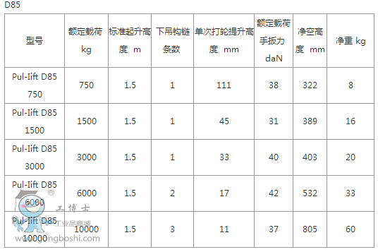 D85 環鏈手拉葫蘆封閉式外殼、手柄和下吊鉤是采用的高強度的白色合金鑄造,整體牢固耐用。任維修、采礦、建筑、鋼材、裝配、造船等多種領域內幾乎擁有無限的用途,是機械等重物移動和定位的理想工具。