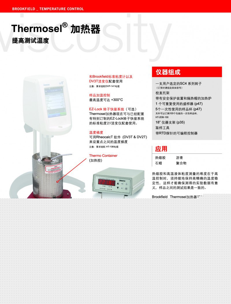 為了產(chǎn)品控制和研發(fā)的需要,為了應(yīng)用能夠更加貼心方便,BROOKFIELD專門設(shè)計(jì)了適合于不同行業(yè)應(yīng)用的配件附件,如溫度控制裝置、小量樣品適配器、超低粘度適配器、升降支架、各類轉(zhuǎn)子測量系統(tǒng)和粘度標(biāo)準(zhǔn)液等。