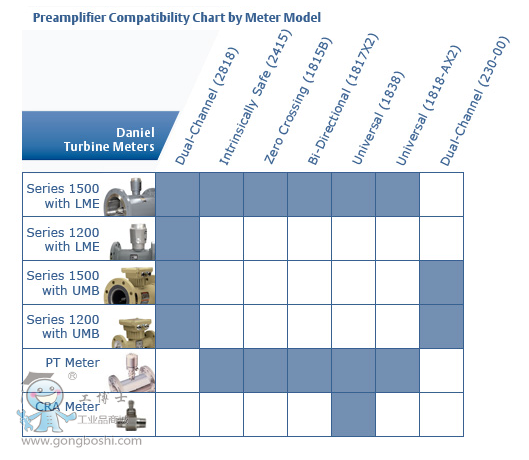 根據儀表型號,可以使用一個或多個前置放大器以適應具體的應用要求。請參閱下面的圖表以確定可用于您的 Daniel 渦輪流量計型號的前置放大器選項。