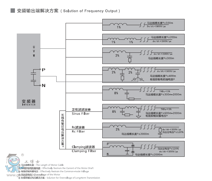 輸出電抗器:用于平滑濾波,降低瞬變電壓dv/dt,延長電機壽命。可以降低電機噪音,減低渦流損耗。降低輸出高次諧波造成的漏電流。保護變頻器內(nèi)部的功率開關(guān)器件。