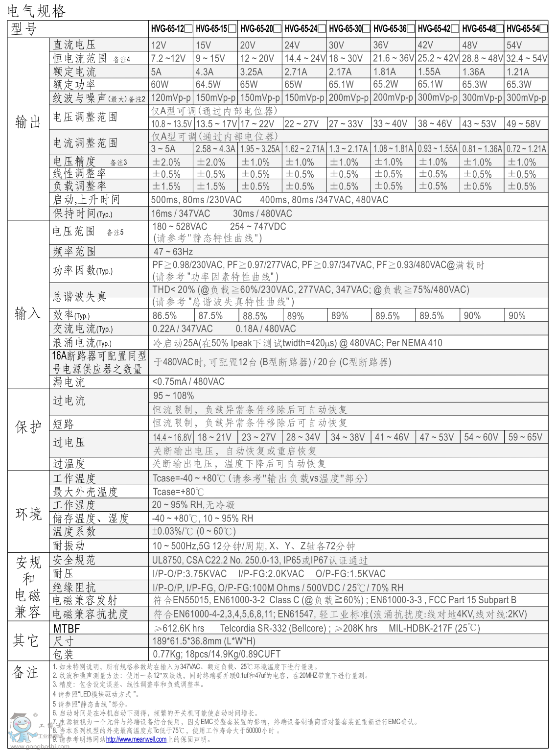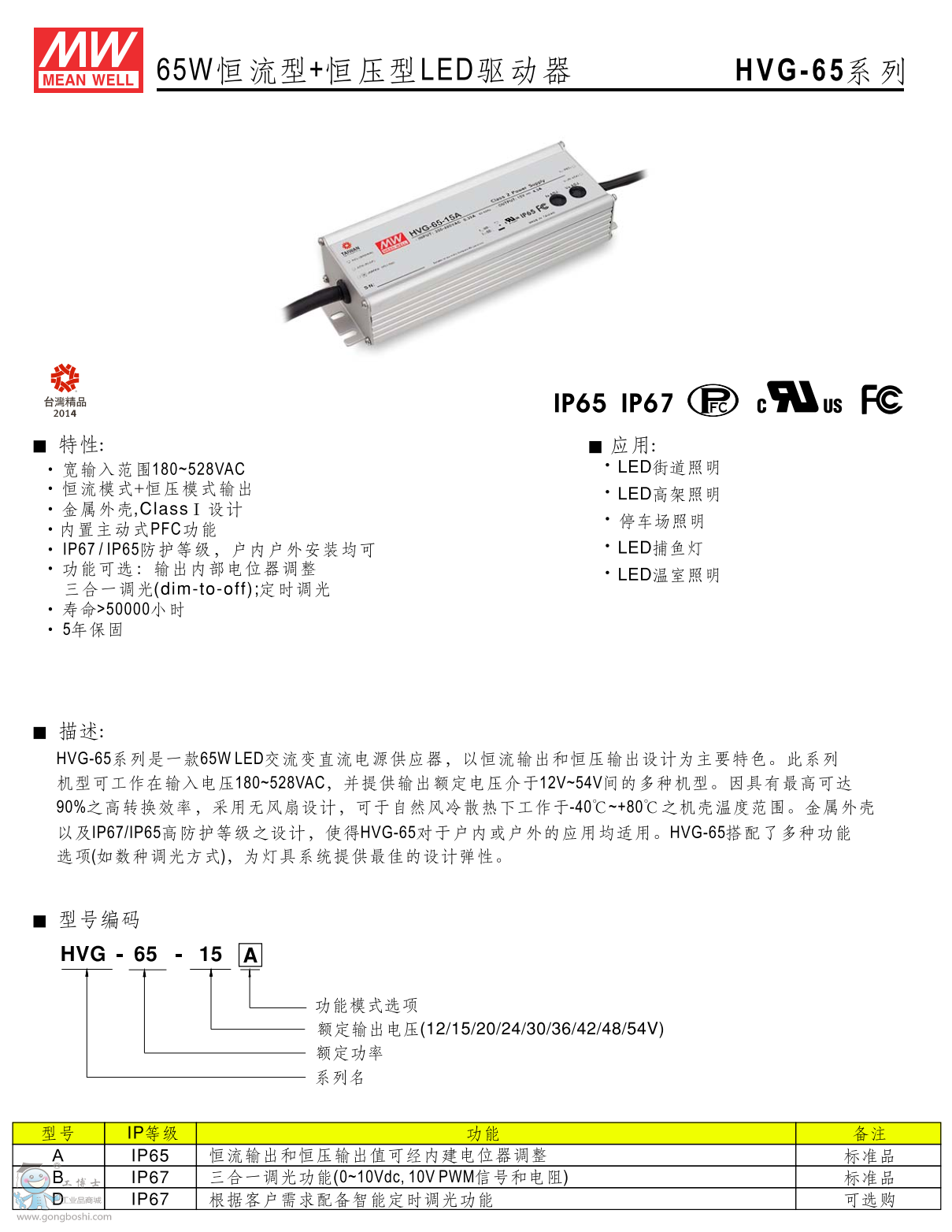 臺灣明緯HVG-65-15A 15V4.3A恒流恒壓LED電源