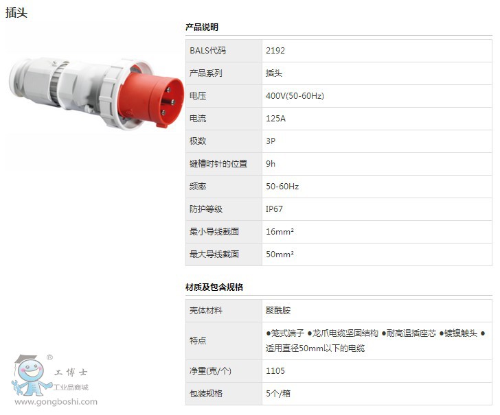 德國霸士BS2192工業插頭 400V/125A/3P/IP67