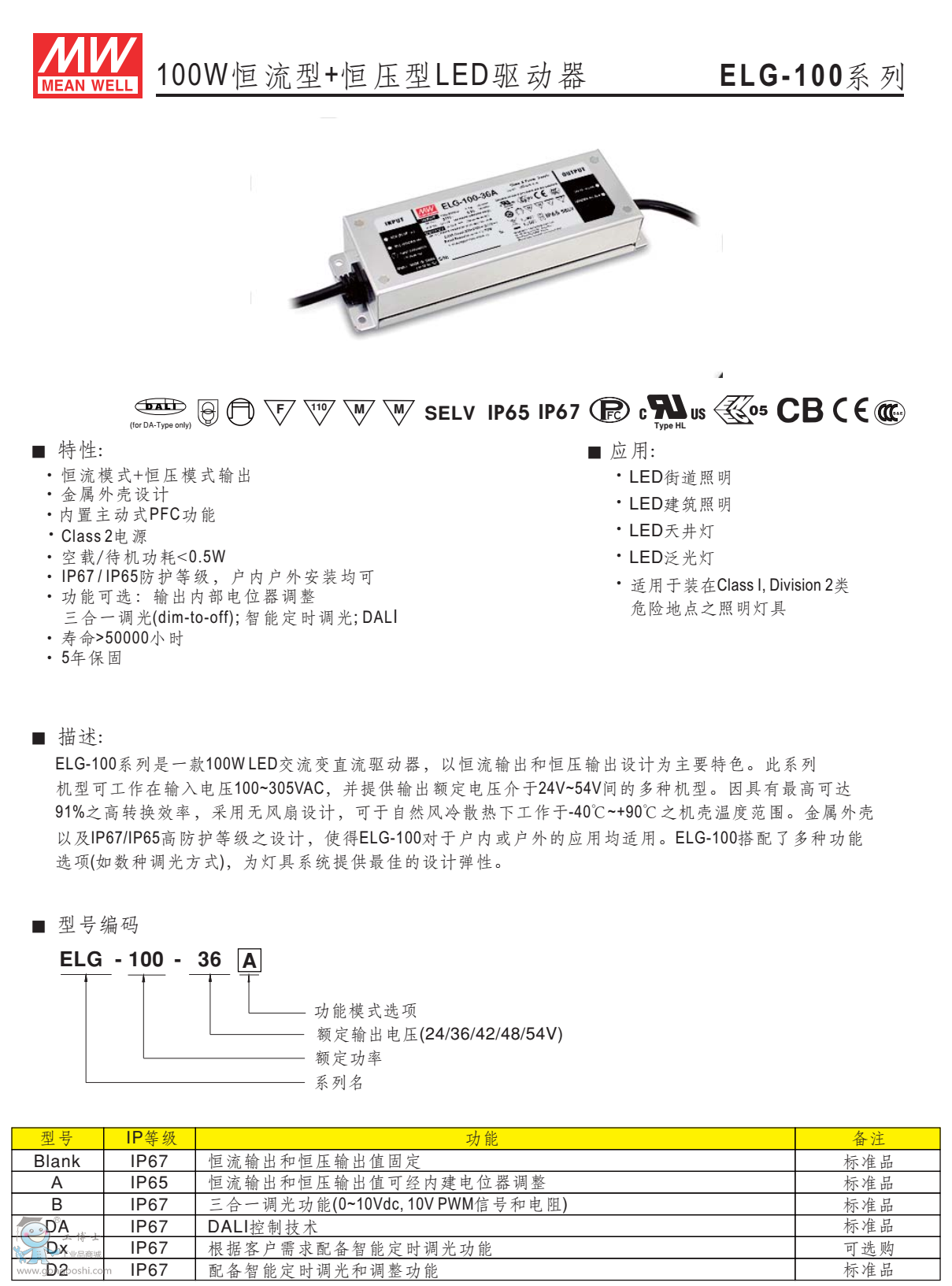 臺灣明緯LED防水電源ELG-100-42A 100W42V2.28A |