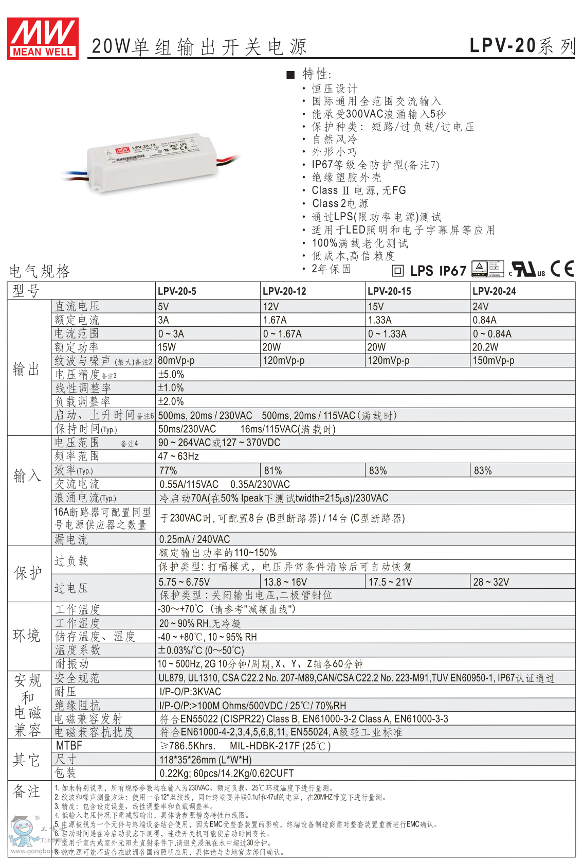 臺灣明緯LPV-20-15 15V1.33A 恒壓LED電源 |